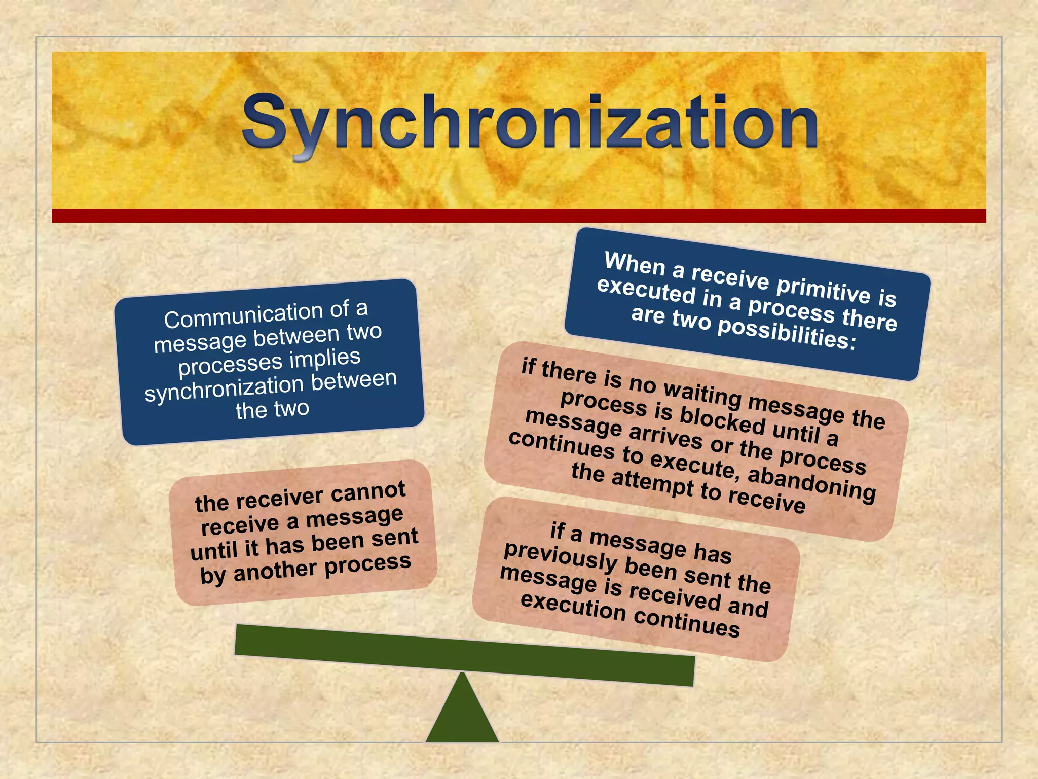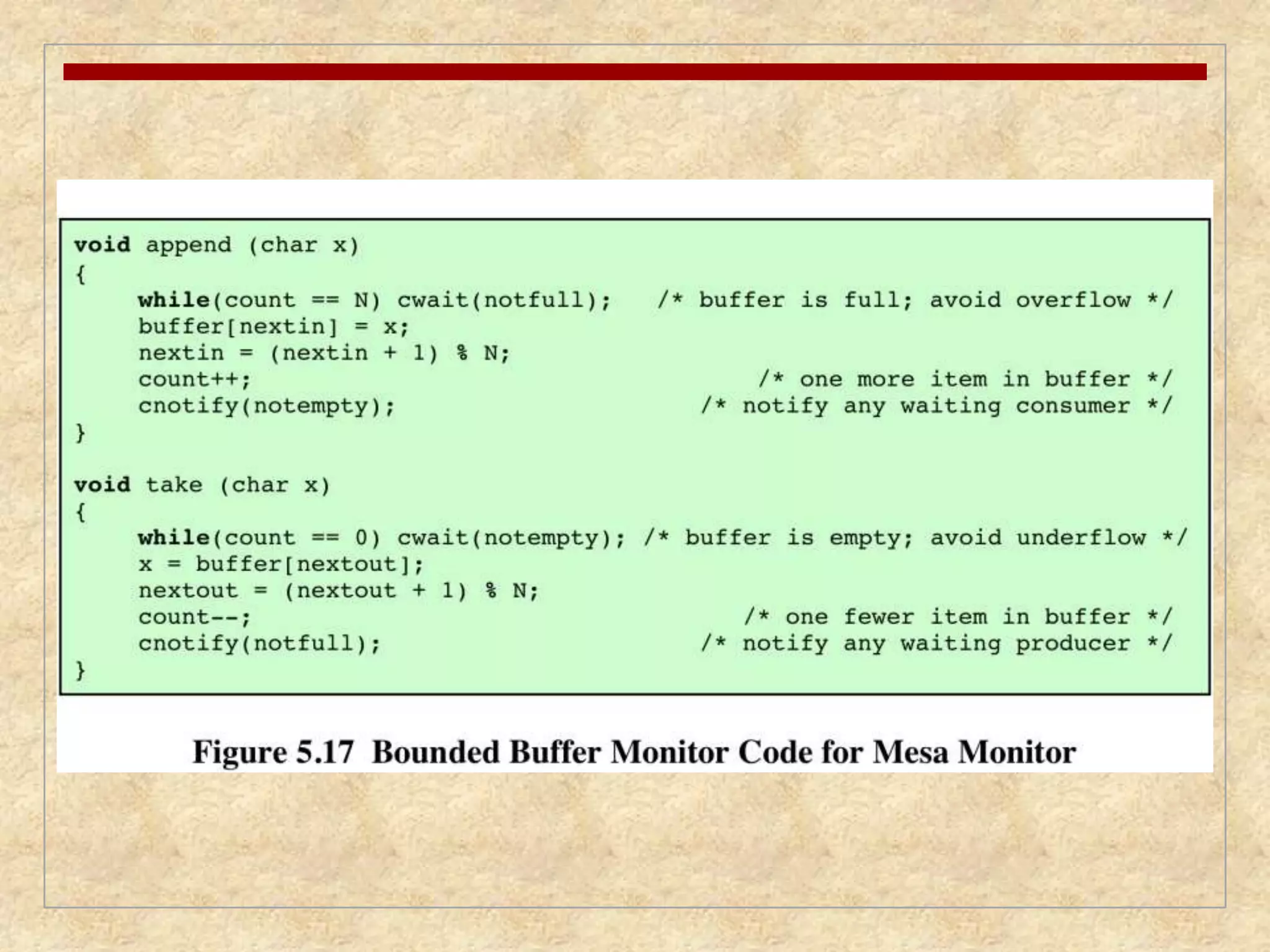 This document discusses concurrency and synchronization in operating systems. It covers mutual exclusion and how it must be enforced to prevent interference between concurrent processes accessing shared resources. Various synchronization mechanisms are described, including semaphores, mutexes, monitors and event flags. The producer-consumer problem is presented and solutions shown using semaphores to ensure processes can access shared resources like buffers safely. Implementation of semaphores also discussed, needing atomic operations.