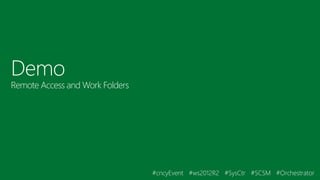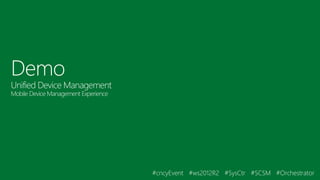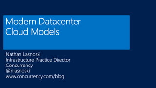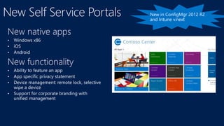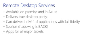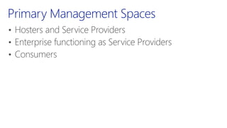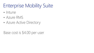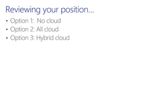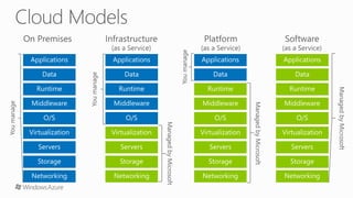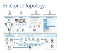 This document discusses Microsoft technologies for on-premise, hybrid, and cloud architectures including System Center, Azure, Office 365, and Windows Server. It highlights capabilities for identity management, virtualization, applications, mobility, and infrastructure management across diverse environments. Key benefits outlined include enabling users to work productively from any location while maintaining security and compliance.