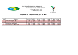 The document contains results from the South American Rhythmic Gymnastics Cup held in Vitória, Espírito Santo, Brazil from May 31 to June 2. It includes classifications for different age groups and apparatus. In the 11-12 years old classification for the hoop apparatus, Barbara Domingos from AGIR-BRA placed first with a total score of 22,100 points. In the same age group for ball, Barbara Domingos also placed first, scoring a total of 21,800 points. In the 11-12 years old classification for ribbon, Ana Santos from UNOPAR-BRA placed first with a total score of 20,150 points.