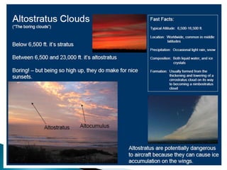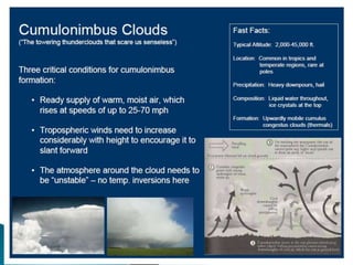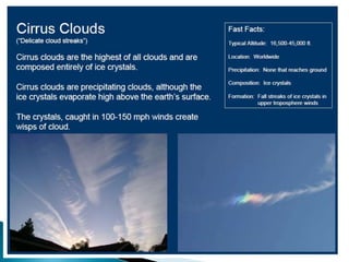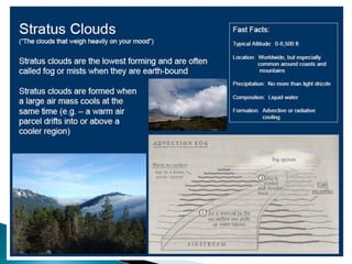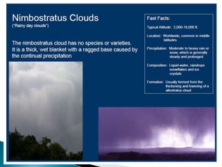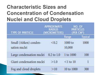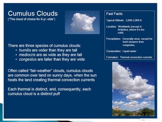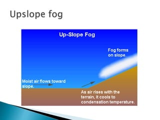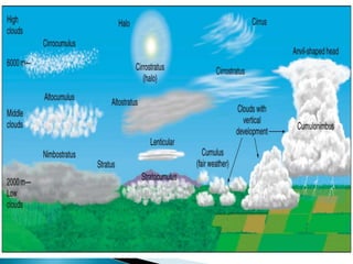 This document discusses condensation and the various cloud and fog formations that result from condensation in the atmosphere. It begins by defining condensation as the process where a gas transforms into a liquid due to changes in pressure and temperature. It then discusses the key factors needed for condensation to occur, including cooling air to below its dew point and the presence of condensation nuclei. The document goes on to describe different types of clouds and fogs that form via condensation, including stratus, cumulus, and nimbostratus clouds, and radiation, advection, upslope and freezing fogs. Key characteristics and formation mechanisms are provided for each cloud and fog type.