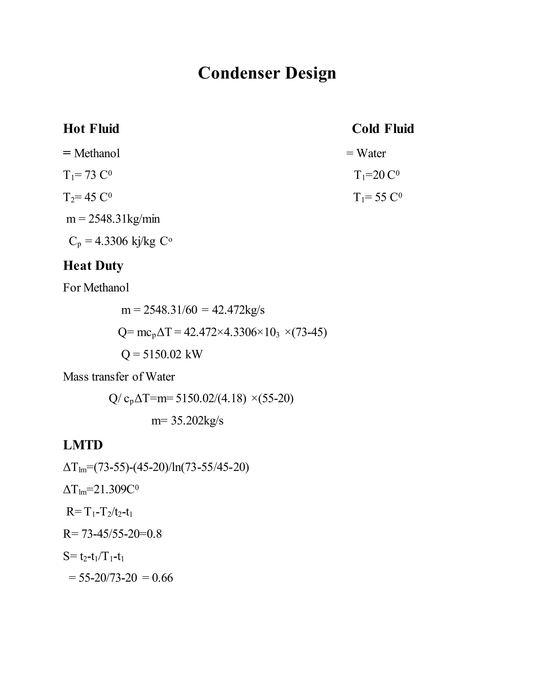 This condenser design uses methanol at 73°C as the hot fluid and water at 20°C as the cold fluid. The methanol exits at 45°C and the water exits at 55°C, with flow rates of 2548.31 kg/min and 35.202 kg/s respectively. The heat duty is 5150.02 kW. The design calls for 1336 water tubes with an internal diameter of 14mm in 8 passes to achieve the necessary heat transfer. The overall heat transfer coefficient is calculated to be 760.24 W/m2.C0.