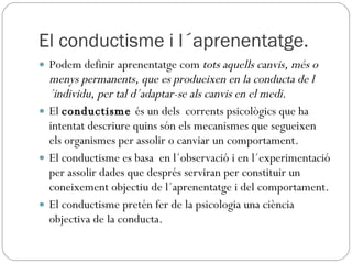 El conductisme il´aprenentatge. Podem definir aprenentatge com tots aquells canvis, més o menys permanents, que es produeixen en la conducta de l´individu, per tal d´adaptar-se als canvis en el medi. El conductisme és un dels corrents psicològics que ha intentat descriure quins són els mecanismes que segueixen els organismes per assolir o canviar un comportament. El conductisme es basa en l´observació i en l´experimentació per assolir dades que després serviran per constituir un coneixement objectiu de l´aprenentatge i del comportament. El conductisme pretén fer de la psicologia una ciència objectiva de la conducta.