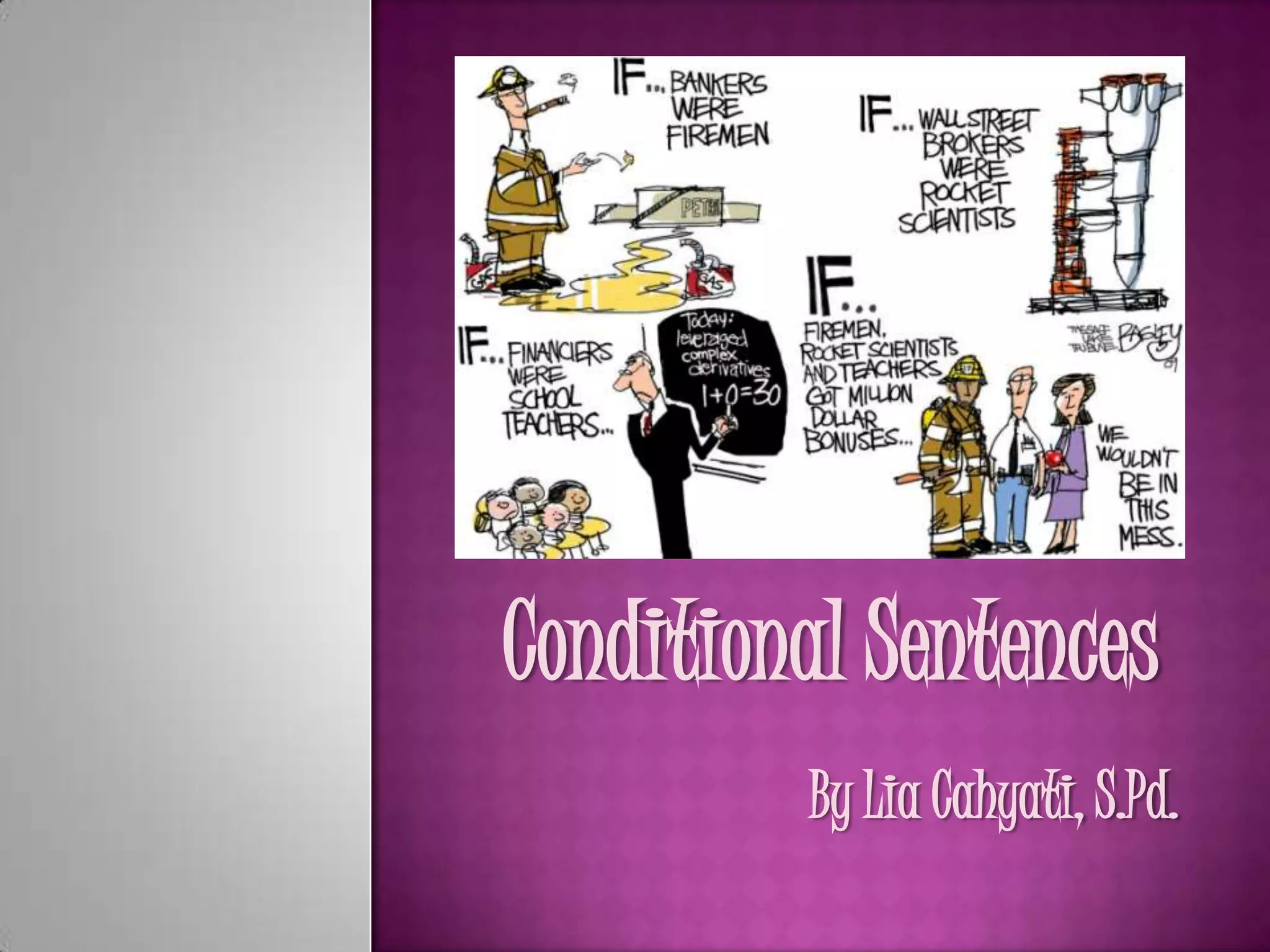 The document discusses conditional sentences in English. There are three main types of conditional sentences: Type 1 uses "if + present, will + verb" to talk about possible future situations. Type 2 uses "if + past, would + verb" to talk about unlikely or imaginary situations. Type 3 uses "if + past perfect, would + have + past participle" to talk about unfulfilled past conditions. There are also special rules for conditional sentences without "if" and those using "unless" or "otherwise".