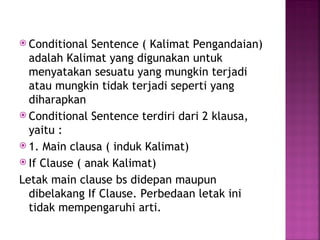 Dokumen ini menjelaskan tentang kalimat pengandaian (conditional sentence) yang terdiri dari dua klausa yaitu main clause dan if clause, serta berbagai jenisnya: type I, II, dan III. Setiap jenis conditional menyatakan keadaan yang berbeda, seperti masa depan, saat ini, dan masa lalu, dengan pola tertentu untuk mengekspresikan kondisi yang mungkin terjadi. Contoh juga diberikan untuk membantu pemahaman tentang penerapan kalimat pengandaian.