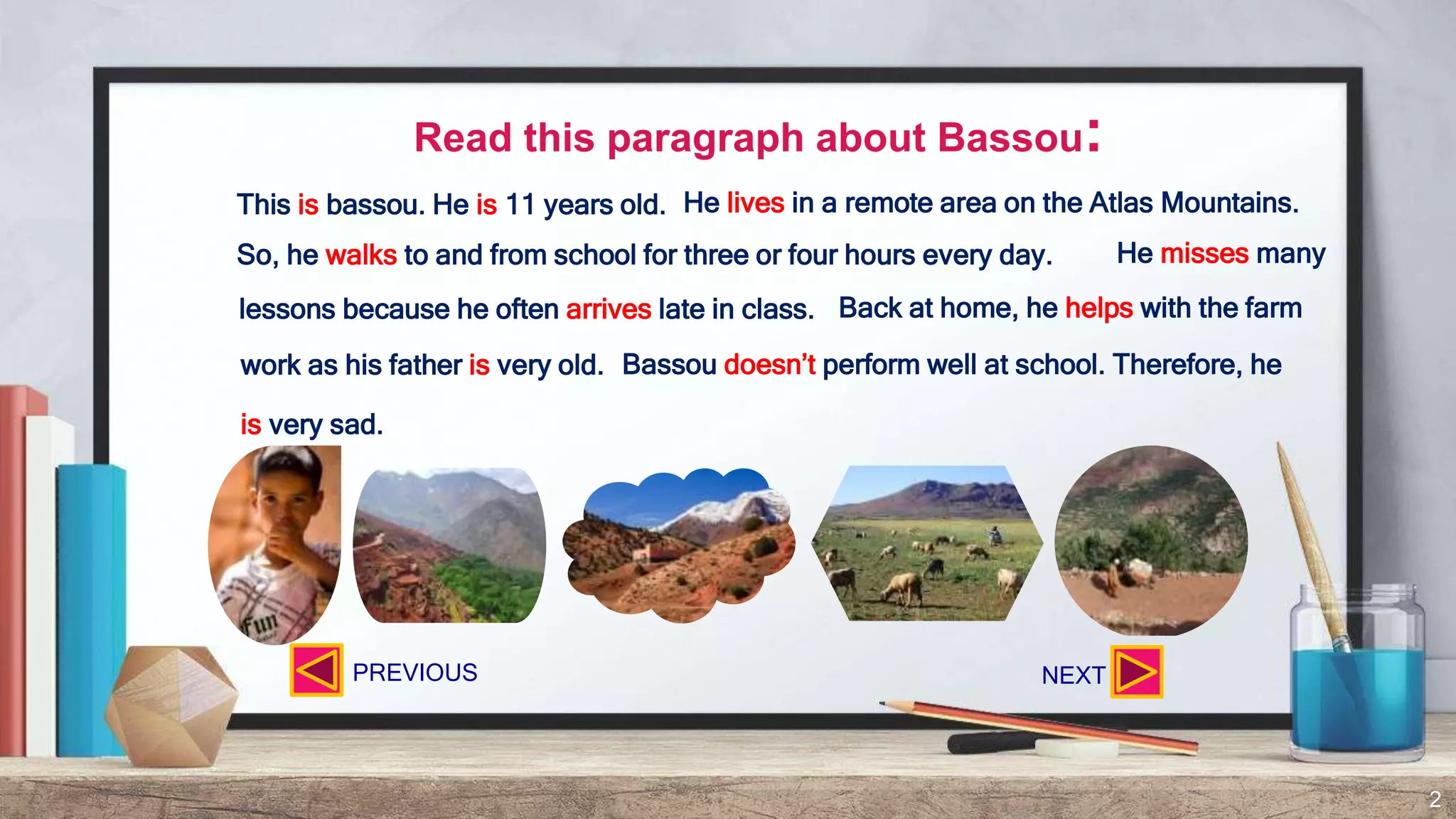 The document provides a grammar practice on conditional type two using the life of a boy named Bassou as an example. It explains how to transform present situations into hypothetical scenarios, highlighting the structure 'if + past simple + would + verb'. Various examples and exercises are included to practice rewriting sentences in conditional form.