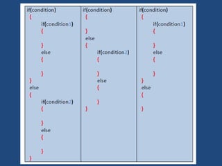 This document summarizes different types of flow control statements in C/C++, including sequential statements, conditional statements, and iterative/looping statements. Conditional statements include if, if-else, nested if-else, and if-else ladder statements. Examples are provided for each type of conditional statement. Pseudocode is given for programs to find the greatest of two numbers using if, enter and output uppercase and lowercase characters, find the greatest of three numbers using nested if-else, and calculate tax based on salary ranges using an if-else ladder.