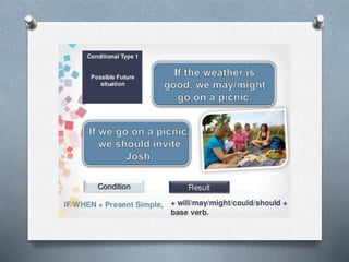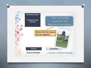 The document provides an overview of conditional sentences, explaining their structure and usage in different types: type 0 for general truths, type 1 for future possibilities, and type 2 for hypothetical situations. Examples illustrate each type's formation and the flexibility of clause ordering. It also includes exercises for practicing each conditional type.