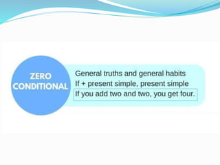 Conditional sentences discuss known factors or hypothetical situations and their consequences. There are four types of conditional sentences that express different meanings and require paying attention to verb tense. The four types are: zero conditional for general truths using simple present tense; type 1 for possible conditions and probable results using simple present and future tenses; type 2 for hypothetical conditions and probable results using simple past and present conditional tenses; and type 3 for unreal past conditions and probable past results using past perfect and perfect conditional tenses. Mixed conditionals discuss unreal past conditions and probable present results using past perfect and present conditional tenses.