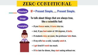 This document discusses three types of conditionals in English: zero, first, and second conditional. The zero conditional is used to describe scientific facts or things that are always true. The first conditional refers to possible present or future situations. The second conditional refers to imaginary or unlikely present or future situations. Examples are provided for each type of conditional.
