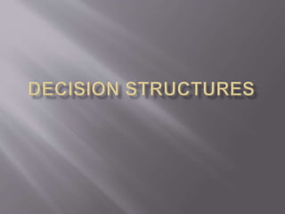 Boolean values represent true and false concepts used in computations, named after George Boole. Programs sometimes need to conditionally execute instructions based on decisions. A conditional or decision structure uses an if statement to check a Boolean condition and execute code if true. Operators like ==, <, > are used to form conditional expressions. Conditionals can be nested to check multiple situations. An else statement complements an if statement, executing code if the if statement is false.