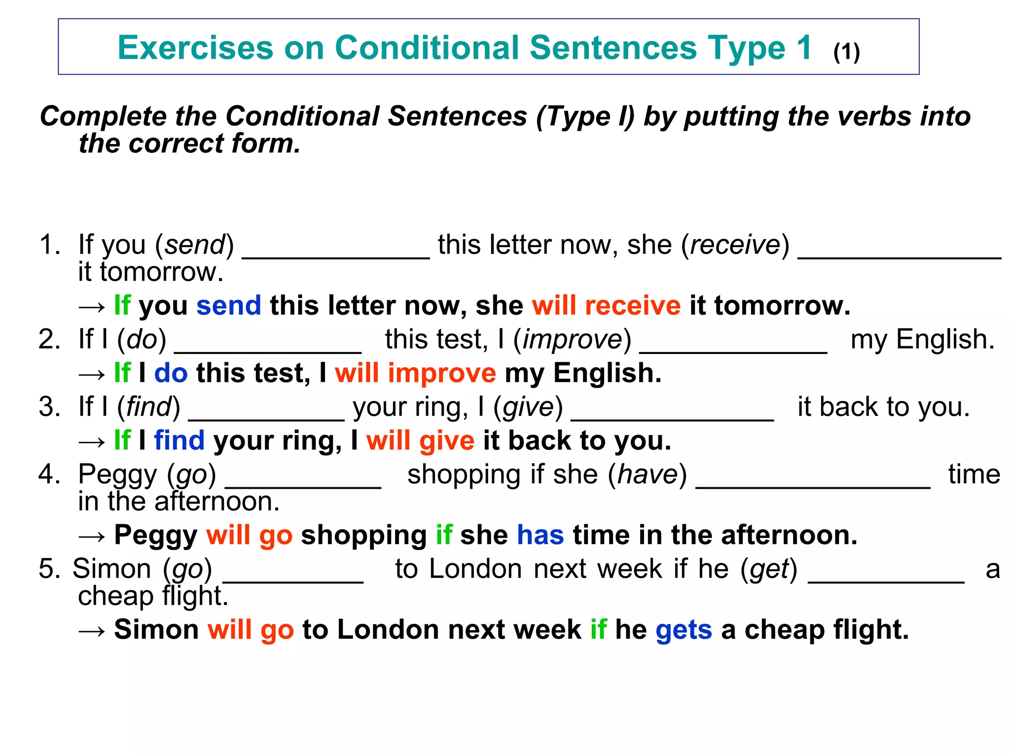 This document contains exercises on conditional sentences of different types. There are exercises to complete conditional sentences by filling in the correct verb forms for type 1, 2 and 3 conditional sentences. There are also exercises that mix different types of conditional sentences. Additional exercises cover conditional sentences with auxiliary verbs and exceptions involving different tenses.