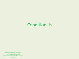 The document discusses conditionals and conditional statements. It identifies that a conditional expresses a cause-effect relationship where situation A is necessary for situation B to occur. Conditionals can be expressed using words like "if", "whenever", "providing", and "can result". Conditional sentences contain an adverbial clause expressing the condition and a main clause expressing the result, with the condition usually preceding the result.