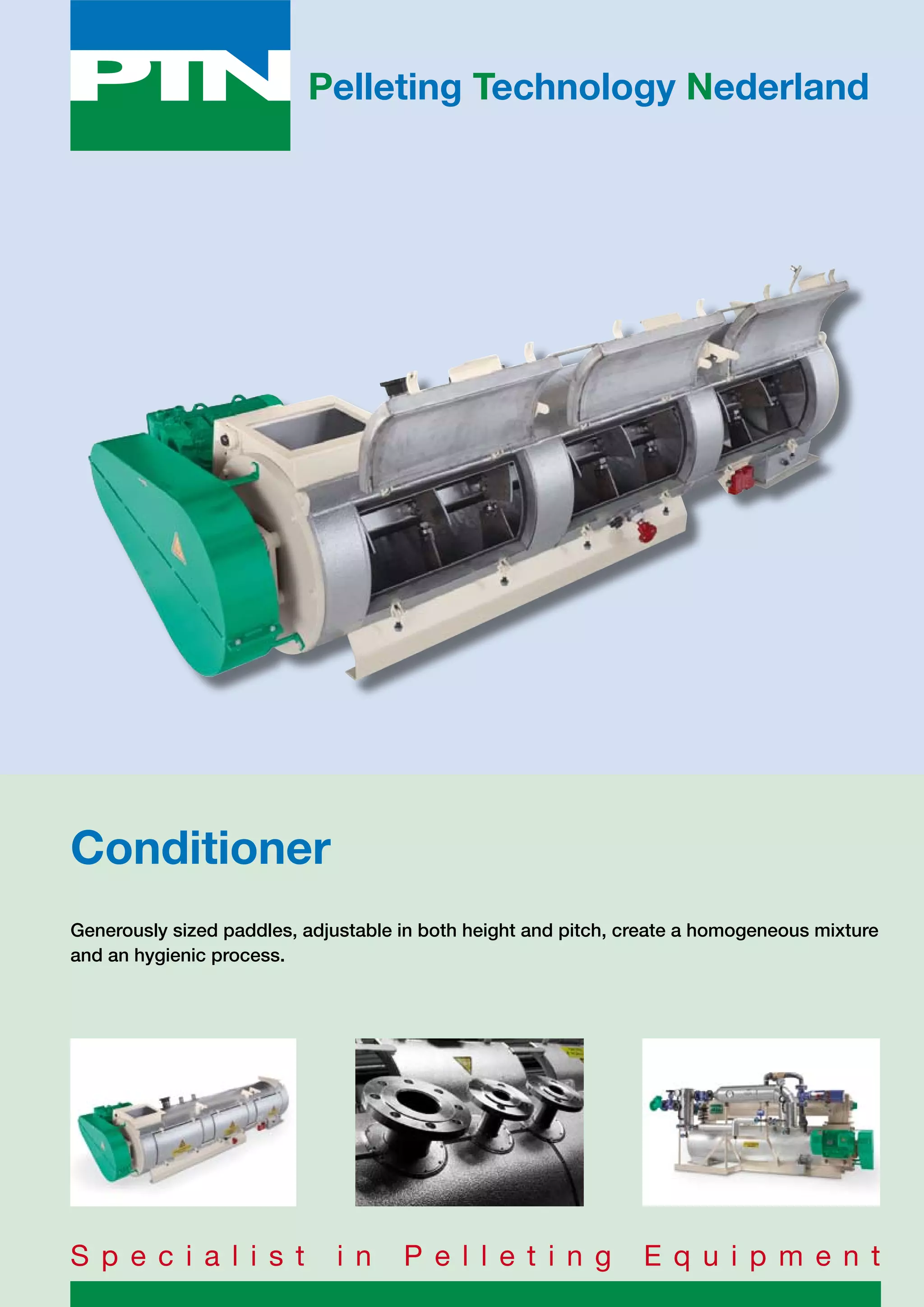 This document provides information about a conditioner manufactured by Pelleting Technology Nederland. The conditioner has generously sized, adjustable paddles that create a homogeneous mixture and hygienic process. It has benefits like homogeneous mixing, optimum absorption of steam and liquids, robust construction, and ease of cleaning. The conditioner is made entirely of stainless steel. A heated conditioner version is also available that prevents condensation and reduces bacterial growth.