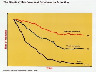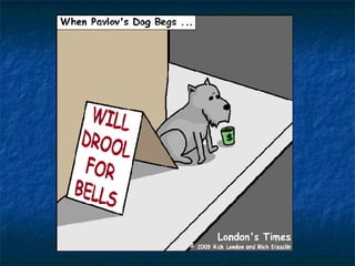 This document provides an overview of classical and operant conditioning. It defines key terms related to classical conditioning such as unconditioned stimulus, unconditioned response, conditioned stimulus, and conditioned response. Classical conditioning examples using Pavlov's dog experiment are provided. The importance of contingency in classical conditioning is discussed. Operant conditioning principles introduced include reinforcers, types of reinforcement schedules, and B.F. Skinner's work developing the operant conditioning chamber. Control procedures and design issues for conditioning experiments are also summarized.