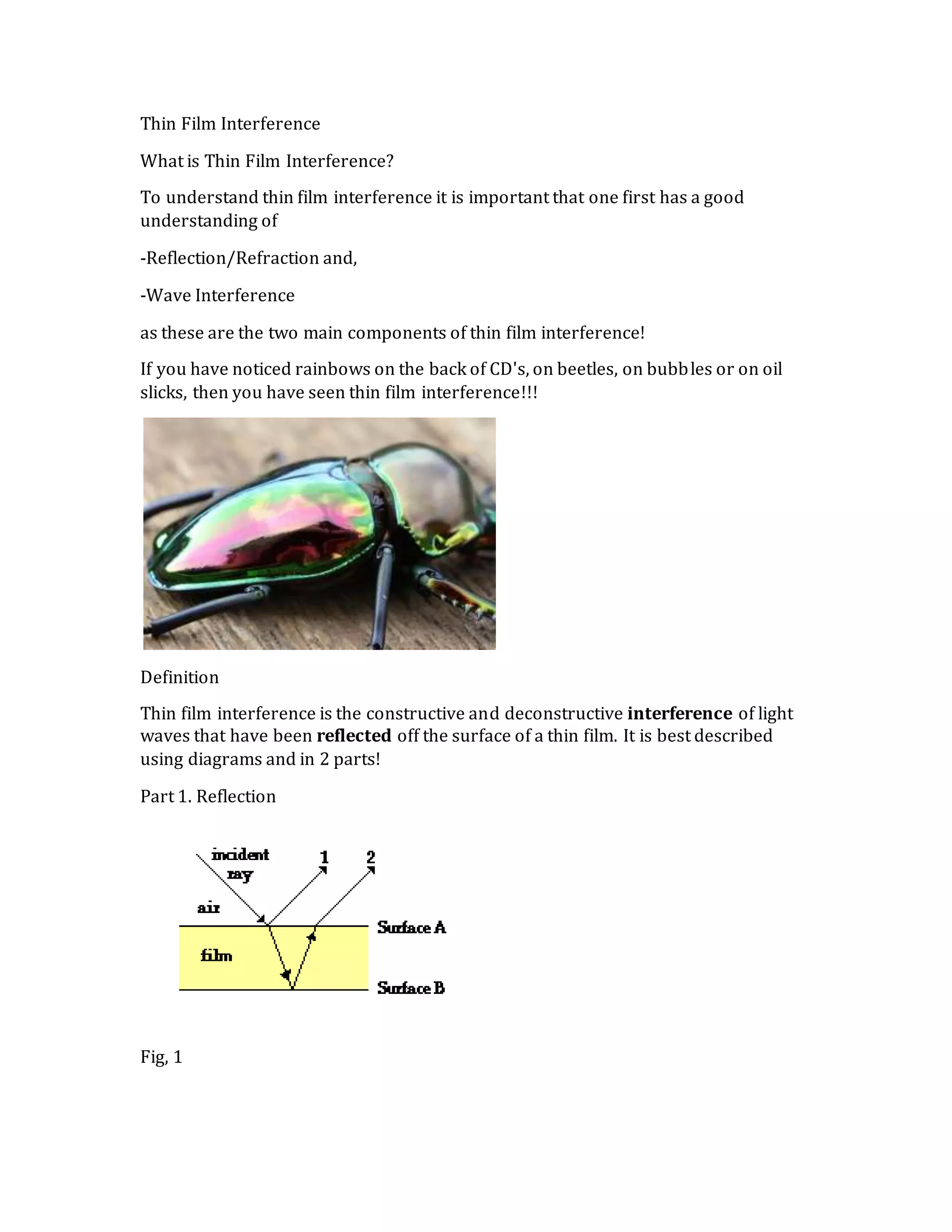 Thin film interference occurs when light waves are reflected off the surface of a thin film and interfere with each other. When the light waves reflected off the top and bottom surfaces of the film are in phase, they constructively interfere and certain wavelengths of light are amplified, producing colors. This explains the rainbow patterns seen on surfaces like oil slicks and beetles. Anti-reflection films are designed to have a thickness that causes the reflected light waves to be out of phase and cancel each other out, reducing reflection.