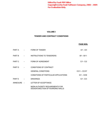 The document is the tender and contract conditions for the construction of a building in Liwan, Dubai. It includes instructions to tenderers on submitting the tender, requirements for site visits, and clarification of contract documents. The tender must include supporting documents such as proof of a site visit and a tender bond. The employer reserves the right to accept or reject any part of the tender. The tenderer is responsible for understanding all project requirements and conditions. No changes can be made to the tender documents except for filling in blanks.