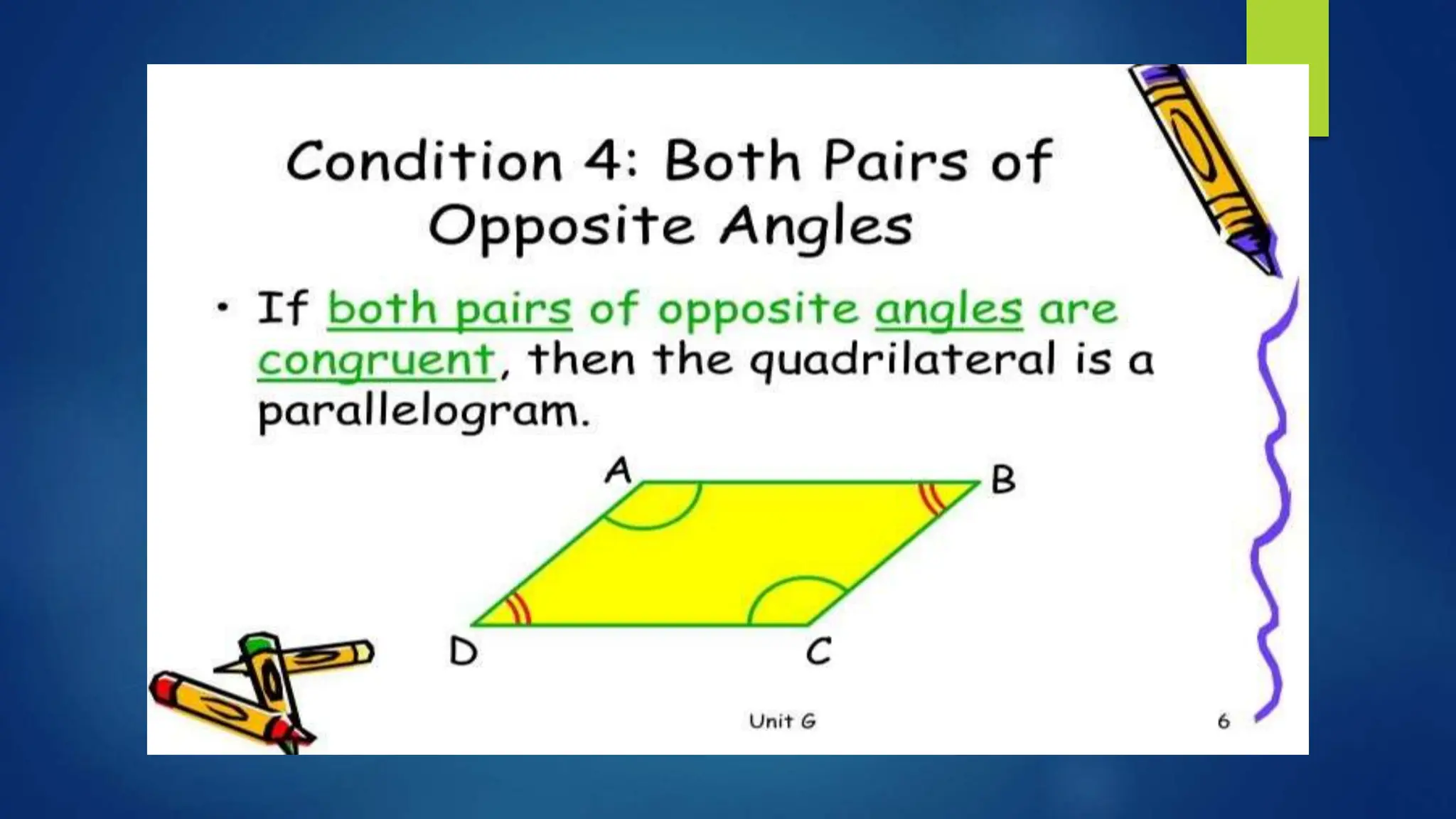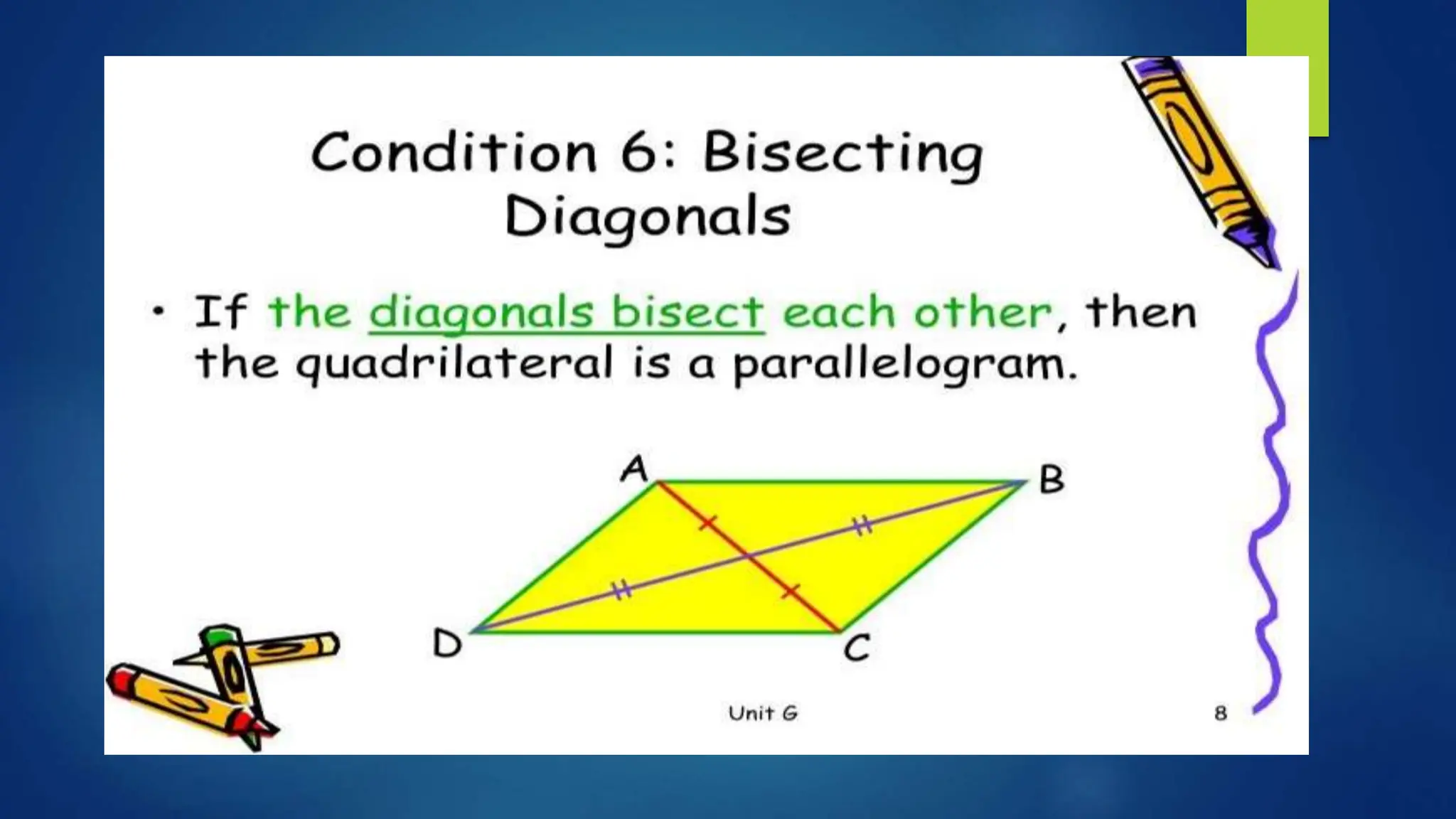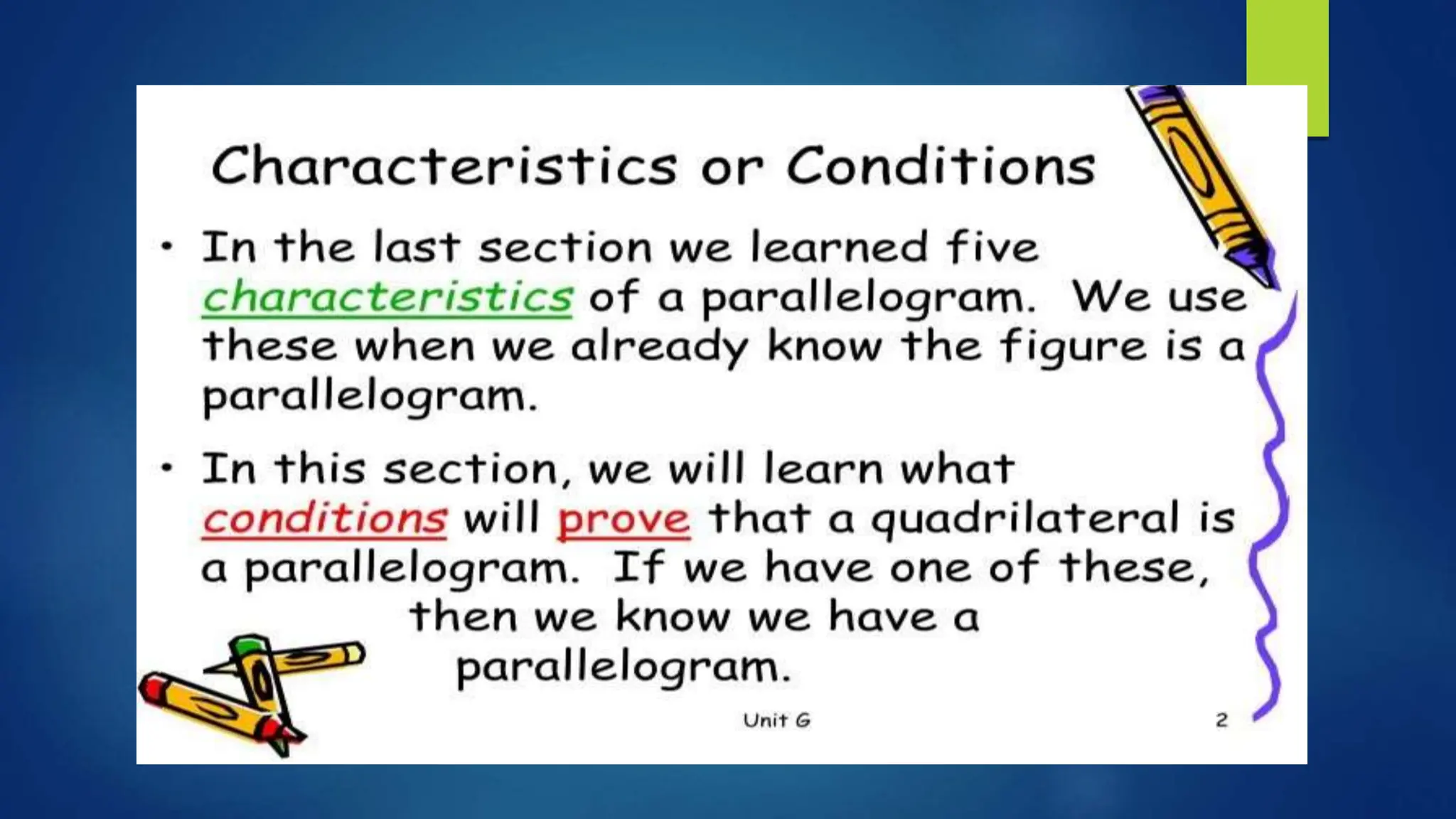 This document provides instructions for students to test their knowledge of the conditions for a quadrilateral to be a parallelogram. Students are asked to state the six conditions, draw an illustration, and then determine if 10 examples of quadrilaterals are parallelograms or not justifying their answers.