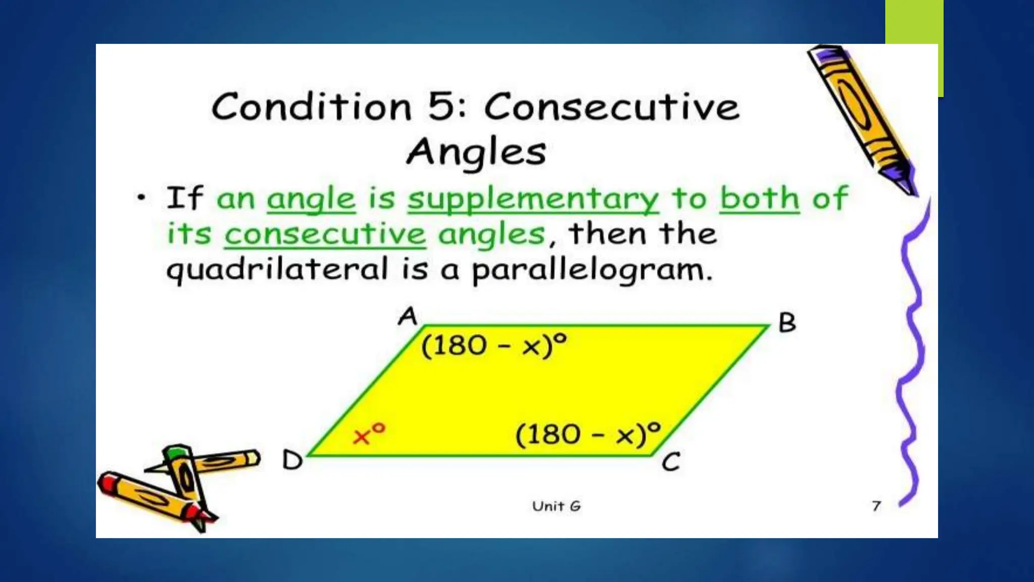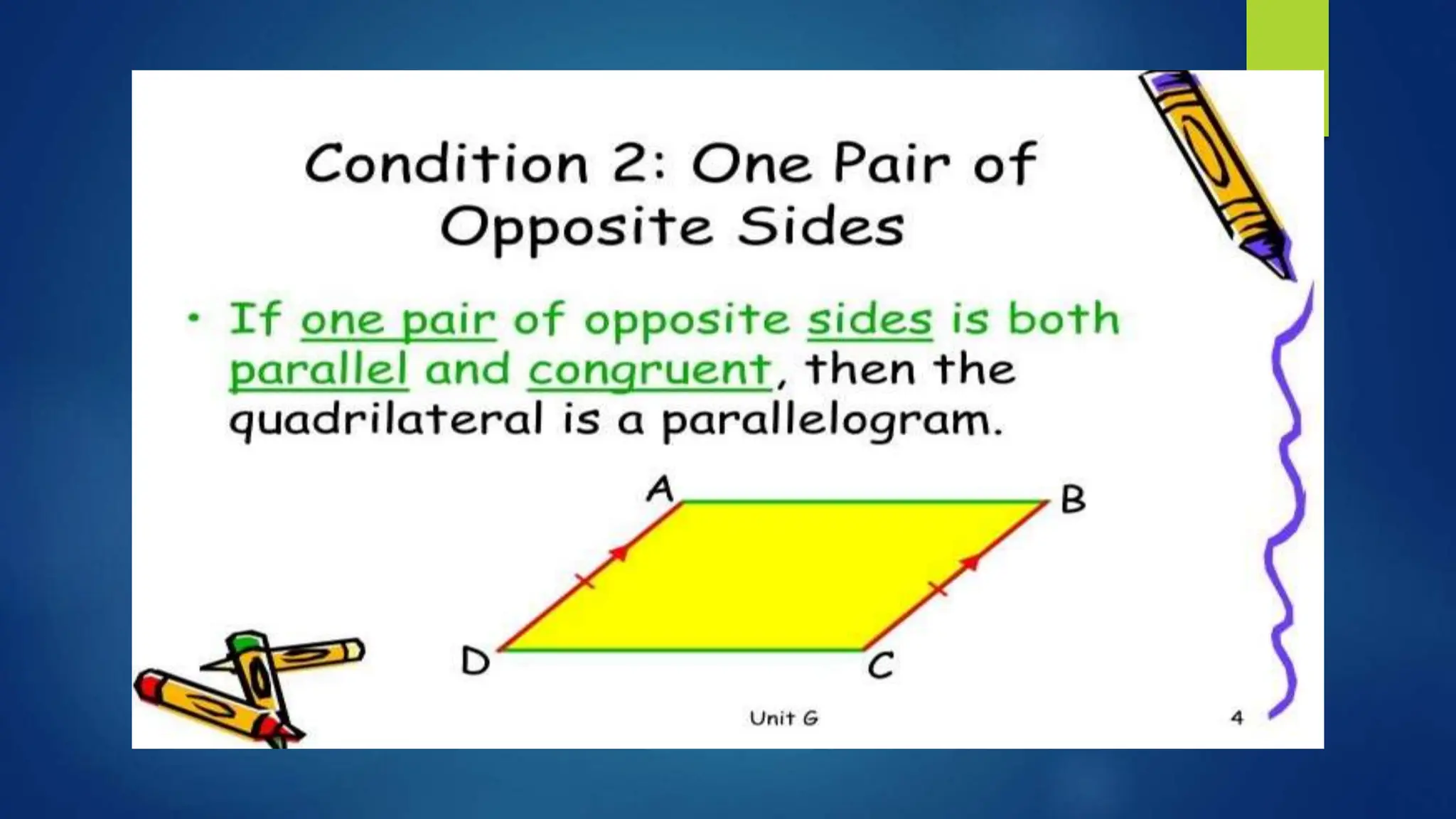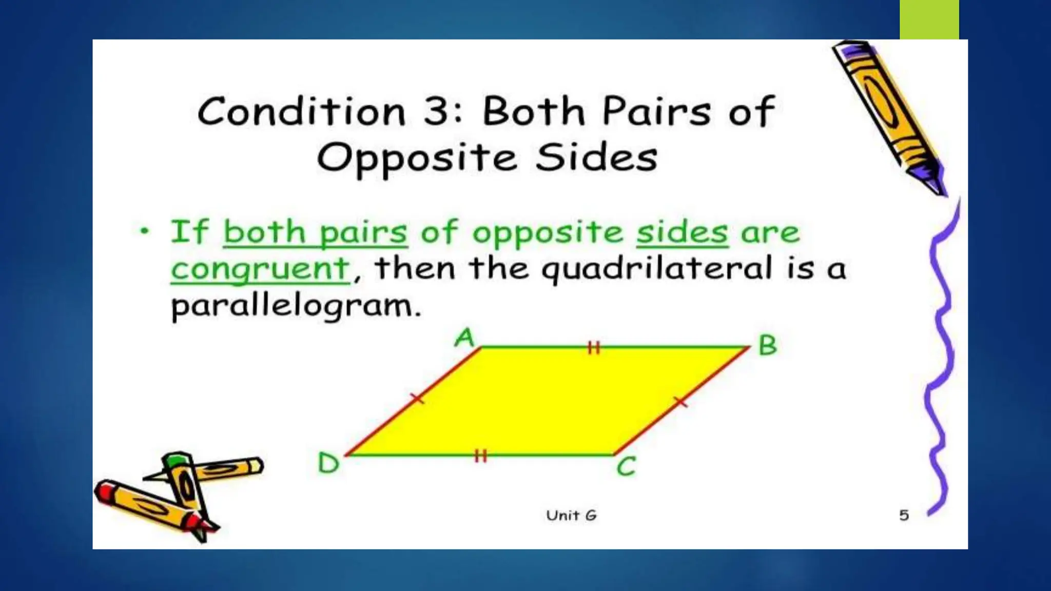 This document provides instructions for students to test their knowledge of the conditions for a quadrilateral to be a parallelogram. Students are asked to state the six conditions, draw an illustration, and then determine if 10 examples of quadrilaterals are parallelograms or not justifying their answers.