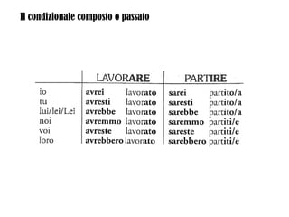 Il documento esplora l'uso del condizionale composto o passato attraverso un dialogo tra Marco e Katia, in cui discutono piani e impegni. Vengono forniti esempi di come questo tempo verbale esprima desideri non realizzati, disappunto per azioni non intraprese e notizie non confermate. Inoltre, si menziona l'utilizzo del condizionale per esprimere il 'futuro nel passato'.