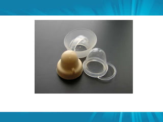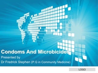 Condoms and microbicides are methods to prevent the transmission of sexually transmitted infections like HIV. Condoms have been used for hundreds of years and come in different types like latex, lambskin, and spermicidal varieties. When used consistently, condoms can reduce the risk of HIV transmission by 80-97%. Microbicides are substances applied vaginally or rectally to reduce STI transmission and are being developed as gels, films, and rings. They offer benefits like female control and protection without a partner's knowledge. Challenges in developing effective microbicides include a lack of surrogate endpoints for efficacy and ensuring large clinical trials can demonstrate their incremental effects over condoms.