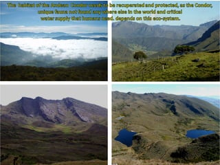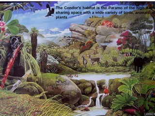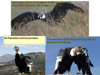 The document discusses the Andean condor population in Colombia and conservation efforts. It notes that the condor population decreased in the late 1980s due to hunting but has since increased due to repopulation projects, including one in Boyaca. The Boyaca project releases condors in Siscunsi paramo and monitors them as they fly to recover ancestral territory. It involves training local guardians and eco-tourism to support conservation of the sacred symbol.