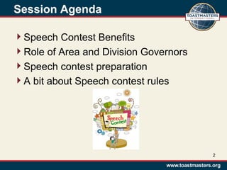 This document provides guidance for Area and Division Governors on conducting quality speech contests. It discusses the benefits of speech contests, the roles of Area and Division Governors, and elements of effective contest preparation and planning. Key recommendations include forming teams of experienced Toastmasters to organize contests, ensuring all judges are trained, gaining experience in roles at lower contest levels before taking on roles at higher levels, using planning guides, scripts and forms from District resources, and providing training and mentoring to contest organizers. The document emphasizes communicating clearly, following contest rules, and promoting contests to clubs.