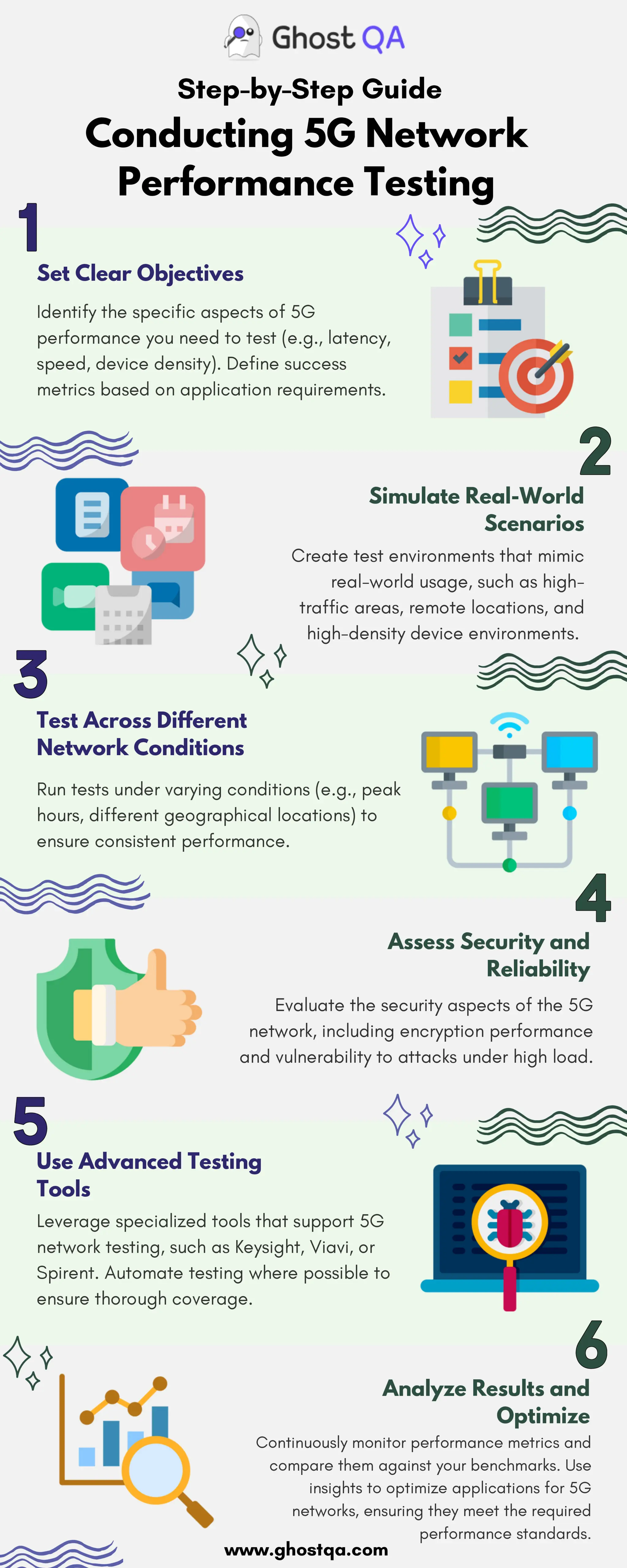 The infographic on "Conducting 5G Network Performance Testing" provides a concise guide for effectively evaluating 5G networks. It covers key steps, including setting clear testing objectives, simulating real-world scenarios, and assessing network performance under varying conditions. The guide emphasizes the importance of end-to-end testing, using advanced tools, and ensuring security and reliability. By following these steps, organizations can optimize their 5G applications for ultra-low latency, high throughput, and the ability to support a vast number of connected devices.