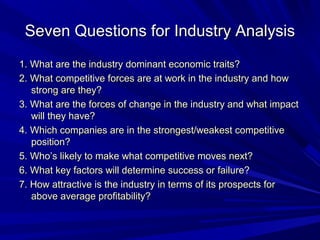 This document outlines seven questions to consider when conducting an industry analysis: 1) What are the dominant economic traits of the industry? 2) What competitive forces are at work and how strong are they? 3) What forces are driving change in the industry and what impact will they have? 4) Which companies are strongest/weakest? 5) What competitive moves might companies make next? 6) What factors will determine success or failure? 7) How attractive is the industry's potential for above-average profits? Answering these questions provides an understanding of the industry's dynamics.