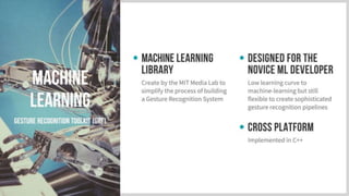 React Native is a mobile app framework that enables the development of native apps using JavaScript, delivering performance comparable to native applications. The document discusses concepts like dynamic time warping for sequence comparison and links to various resources including demo code and applications. Additionally, it provides links to tools and libraries such as the Gesture Recognition Toolkit and the AirConductor app.