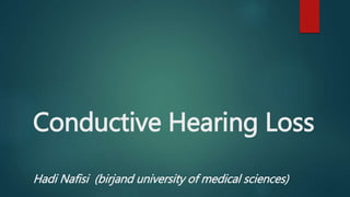 This document discusses conductive hearing loss, which occurs when sound is not properly conducted from the outer ear to the inner ear. Common causes of conductive hearing loss include cerumen impaction, middle ear fluid, and fixation of the small bones in the ear. The document describes various causes of conductive hearing loss affecting the outer ear, such as infections, trauma, tumors, and congenital abnormalities, as well as middle ear causes like otitis media, cholesteatoma, and otosclerosis. Diagnostic tests for conductive hearing loss include the Weber test, Rinne test, tympanometry, and audiometry to measure air and bone conduction thresholds.