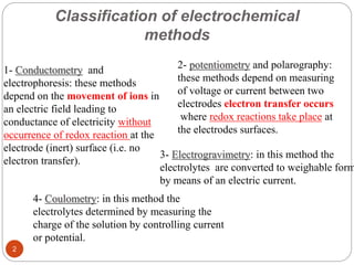 This document discusses conductometry, which is a method of analysis based on measuring the electrolytic conductance of a solution. It begins by classifying different electrochemical methods, including conductometry and electrophoresis which do not involve redox reactions. It then discusses key concepts in conductometry such as conductivity, conductance, equivalent conductance, and how various factors like ion nature, temperature, concentration, and electrode size affect conductance. It also provides examples of calculating conductance and equivalent conductance from experimental measurements. Instrumentation for conductometric determination includes a conductance cell and conductivity bridge.