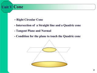 This document discusses different types of cones in 3D geometry, including right circular cones and quadratic cones. It provides definitions and properties of cones, as well as theorems regarding their equations. Specifically, it states that the equation of a cone with vertex at the origin is homogeneous of degree 2, and that every homogeneous degree 2 equation represents a cone. It also defines a right circular cone as one generated by lines making a constant angle with the axis, and proves its cross-sections perpendicular to the axis are circles. Finally, it briefly mentions intersections of lines with cones and tangent planes/normals to cones.