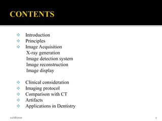 This document provides information on cone beam computed tomography (CBCT) imaging in dentistry. It discusses the principles of CBCT, including X-ray generation and detection, image reconstruction, and clinical considerations for protocols. CBCT uses a cone-shaped X-ray beam and area detector to create a 3D volume of the region of interest with less radiation than medical CT. It has various applications in dentistry for implant planning, orthodontic assessment, and pathology diagnosis. Potential artifacts are also described.