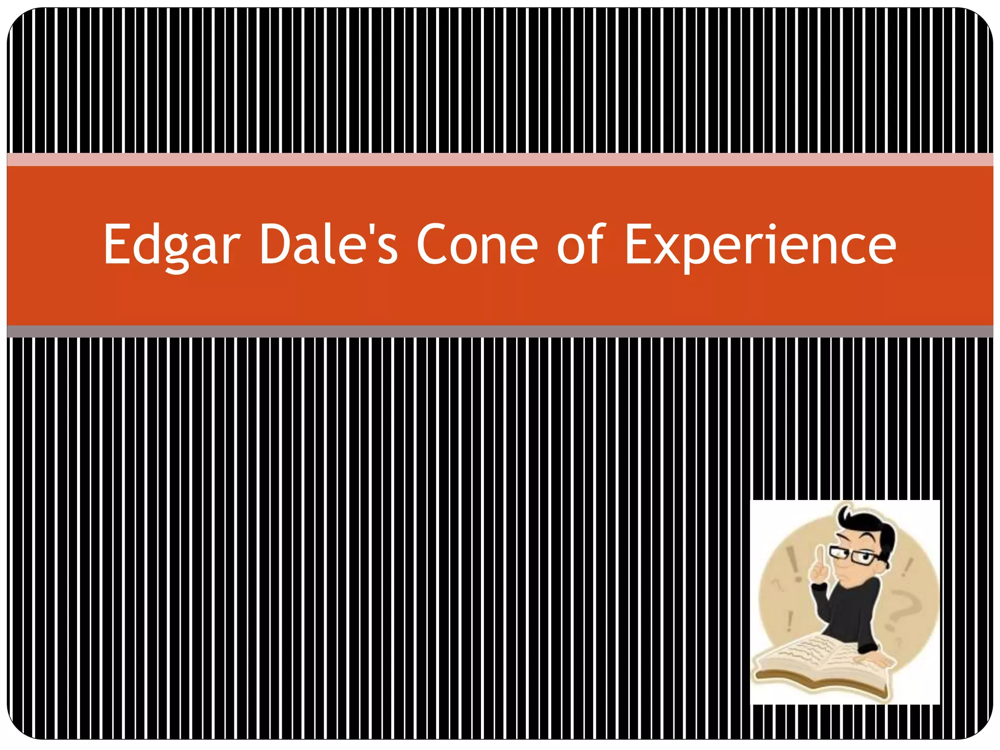 Edgar Dale developed the Cone of Experience to show the relationship between how information is presented in instruction and learner outcomes. At the base of the cone are more concrete experiences like direct participation. As the cone narrows, experiences become more abstract, ending with symbolic representations using words and symbols. The cone was influenced by theories that learning progresses from concrete to abstract. It is often misinterpreted as requiring instruction to always move from bottom to top, but Dale intended it as a tool to help teachers select effective media to move students between concrete and abstract understanding.