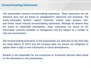 The document provides details from Braskem's 1Q13 earnings conference call held on May 13, 2013. It highlights that Braskem achieved an EBITDA of R$937 million in 1Q13, up 10% from the recurring EBITDA in 4Q12. It also notes that construction of Braskem's integrated petrochemical project in Mexico is 26% complete physically and that the first disbursement of project financing is expected in 2Q13. Additionally, it outlines Braskem's priorities going forward as focusing on strengthening client relationships, advancing industrial policies in Brazil, boosting competitiveness, progressing the Mexico project, and maintaining financial strength.