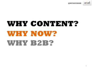 The document discusses strategies and trends in B2B marketing and sales. It notes that 67% of the B2B buyer journey is now digital, and that peer references and social media engagement are important. It also emphasizes that B2B buyers are more informed than ever and seek information independently of sales pitches. Successful strategies require understanding buyers' needs at each stage, from awareness to consideration to relationship building, and providing personalized, relevant content.