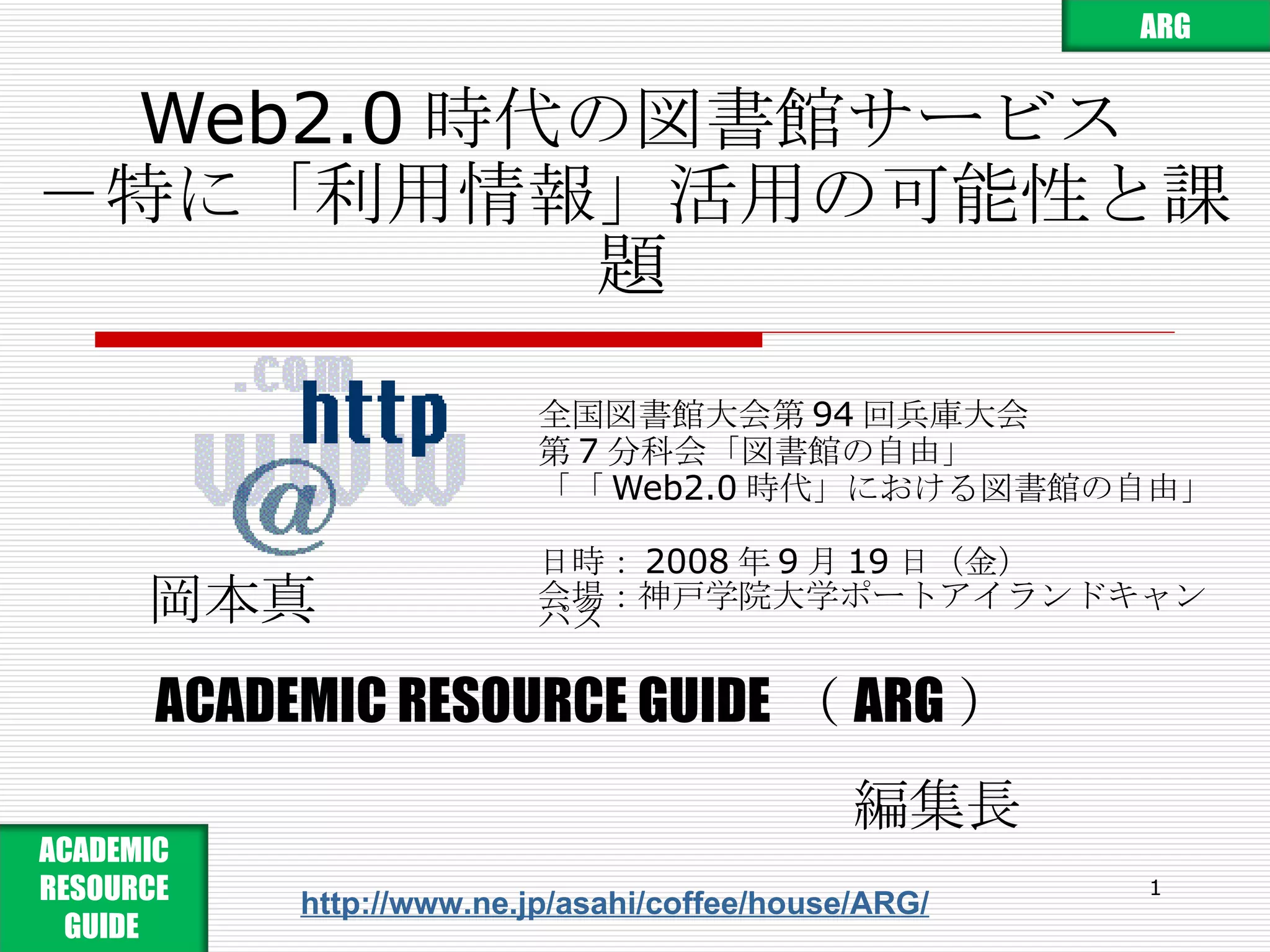 Web2.0 時代の図書館サービス -特に「利用情報」活用の可能性と課題全国図書館大会第 94 回兵庫大会 第 7 分科会「図書館の自由」 「「 Web2.0 時代」における図書館の自由」 日時: 2008 年 9 月 19 日 ( 金 ) 会場: 神戸学院大学ポートアイランドキャンパス 岡本真 ACADEMIC RESOURCE GUIDE ( ARG ) 編集長 http://www.ne.jp/asahi/coffee/house/ARG/ ARG ACADEMIC RESOURCE GUIDE - 2.