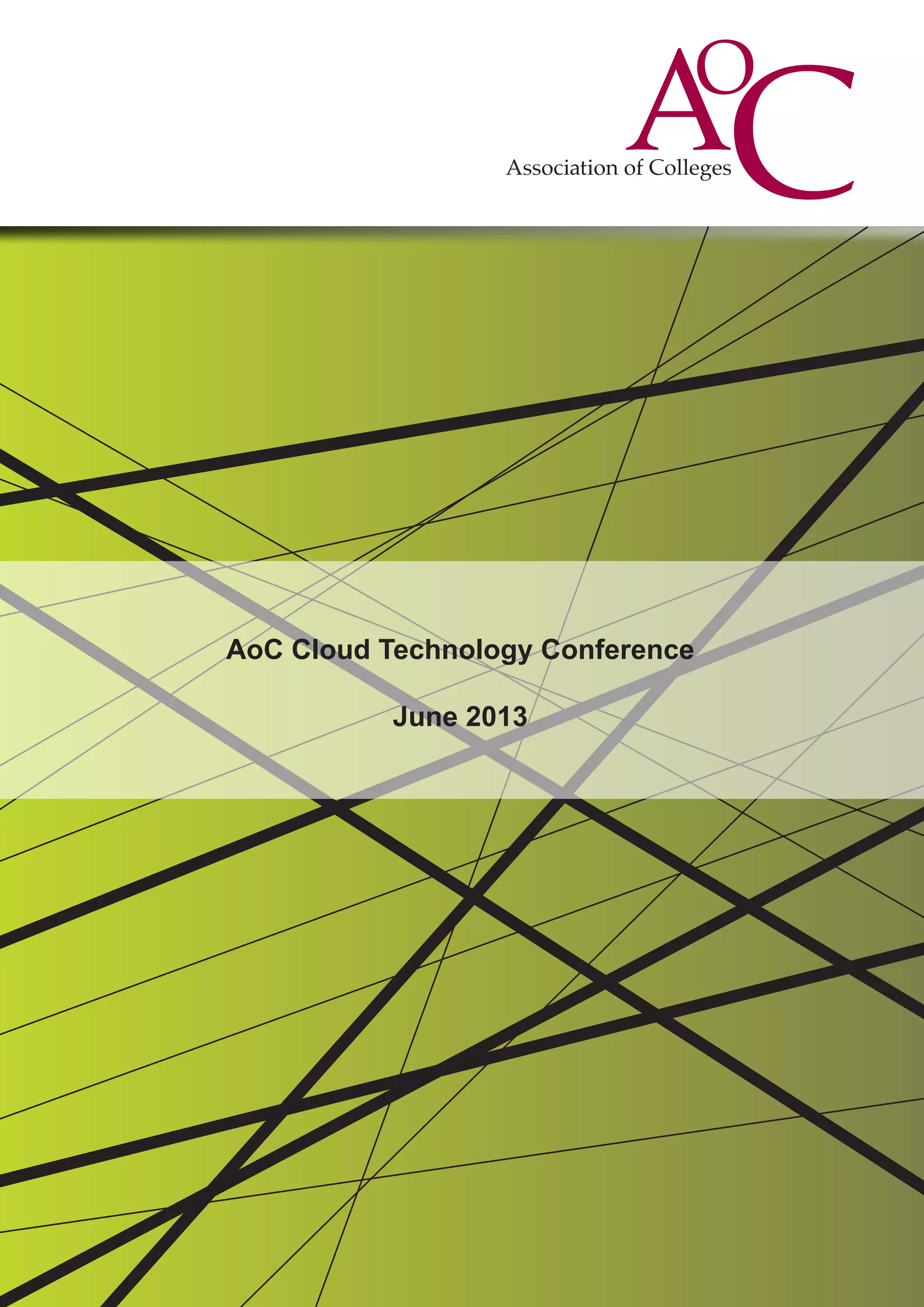 The document summarizes the AoC Cloud Technology Conference held in June 2013. It provides highlights from keynote speakers who discussed the role of cloud services, challenges of moving to the cloud, and case studies of colleges partnering with cloud computing providers. Breakout sessions provided more details on implementing cloud data centers, managing student information in the cloud, virtual desktop infrastructure, and making cloud computing effective for colleges. The conference aimed to help colleges understand cloud opportunities and how to integrate cloud services strategically.