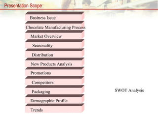 The document provides an overview of the US confectionery market, including market size and forecasts, segmentation, sales trends, seasonality, new products, promotions, distribution channels, major competitors like Hershey and Mars, demographic profiles, and trends in the industry. It analyzes data from sources like IRI, the US Census Bureau, NCA, and competitor annual reports to understand category dynamics and opportunities.