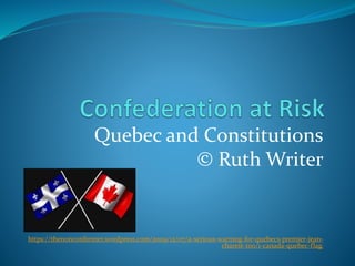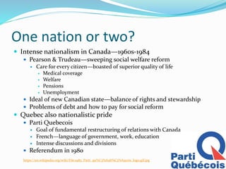 This document discusses the history of social welfare reform and nationalism in Canada from the 1960s-1980s. Key events included intense social welfare reforms under Pearson and Trudeau, the rise of Quebec nationalism and the Parti Quebecois movement seeking independence. This led to constitutional debates, two sovereignty referendums in Quebec, and the patriation of the constitution with the Charter of Rights and Freedoms in 1982, establishing a new framework for Canadian national identity and federal-provincial relations.