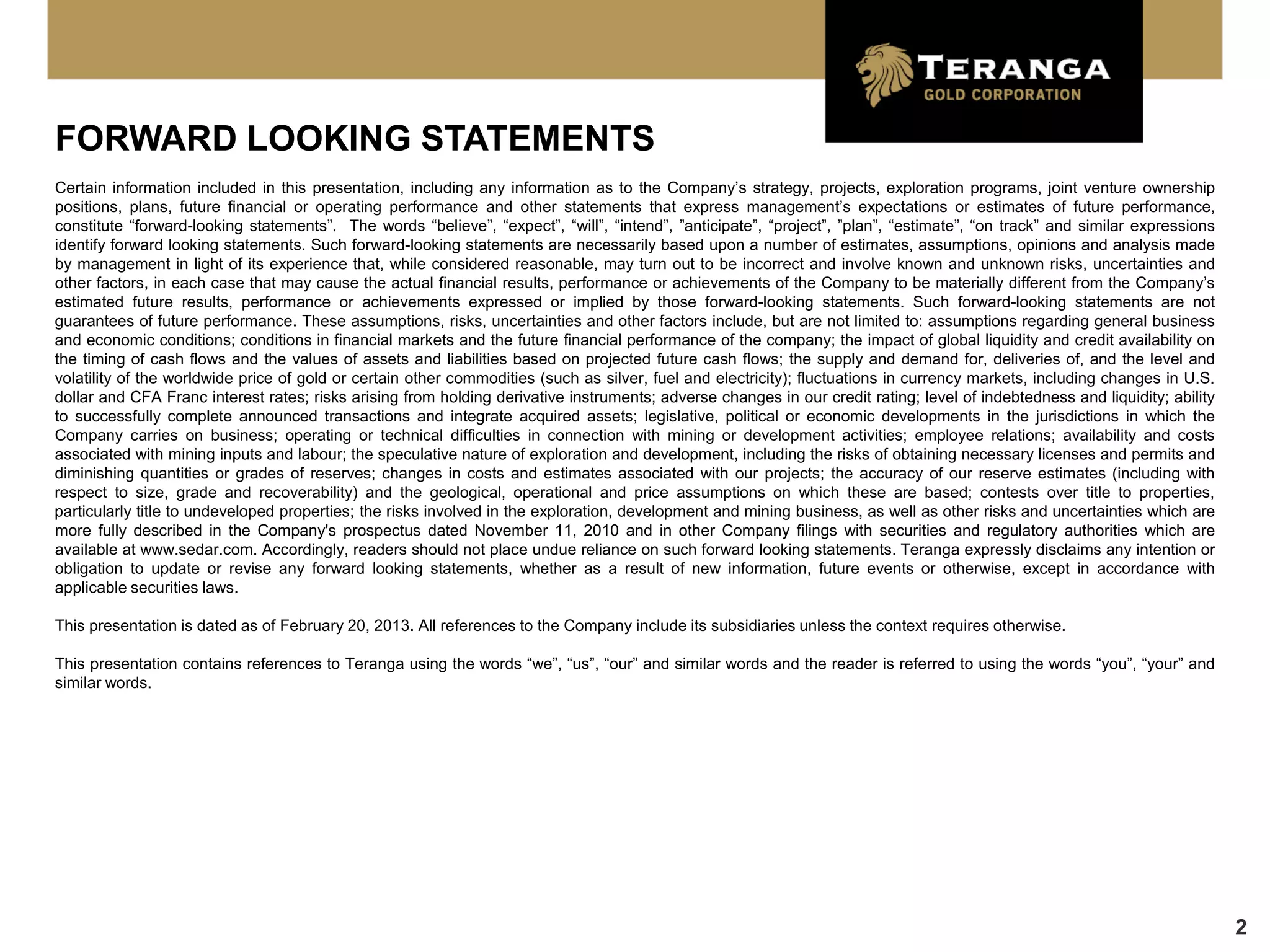 - Teranga produced 214,310 ounces of gold in 2012 at a cash cost of $627 per ounce and expects to produce 190,000-210,000 ounces in 2013 at a cash cost of $650-700 per ounce.