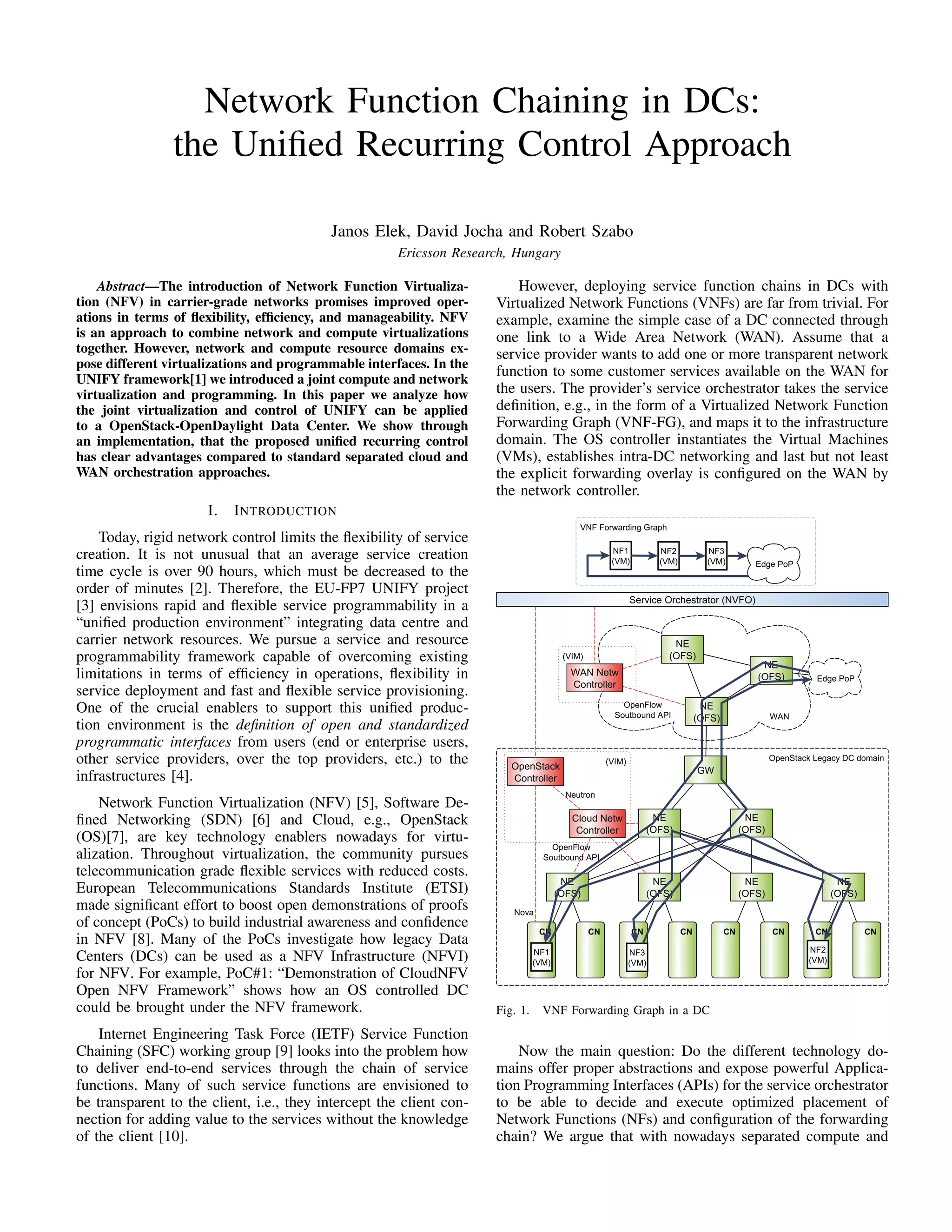 This paper discusses the benefits of a unified recurring control approach to network function chaining within data centers, utilizing network function virtualization (NFV) and software-defined networking (SDN) technologies. It highlights the limitations of traditional, separated orchestration methods and presents a design for joint compute and network virtualization that enhances service deployment efficiency and flexibility. The implementation demonstrates significant advantages in the orchestration of cloud and wide area network resources compared to existing solutions.