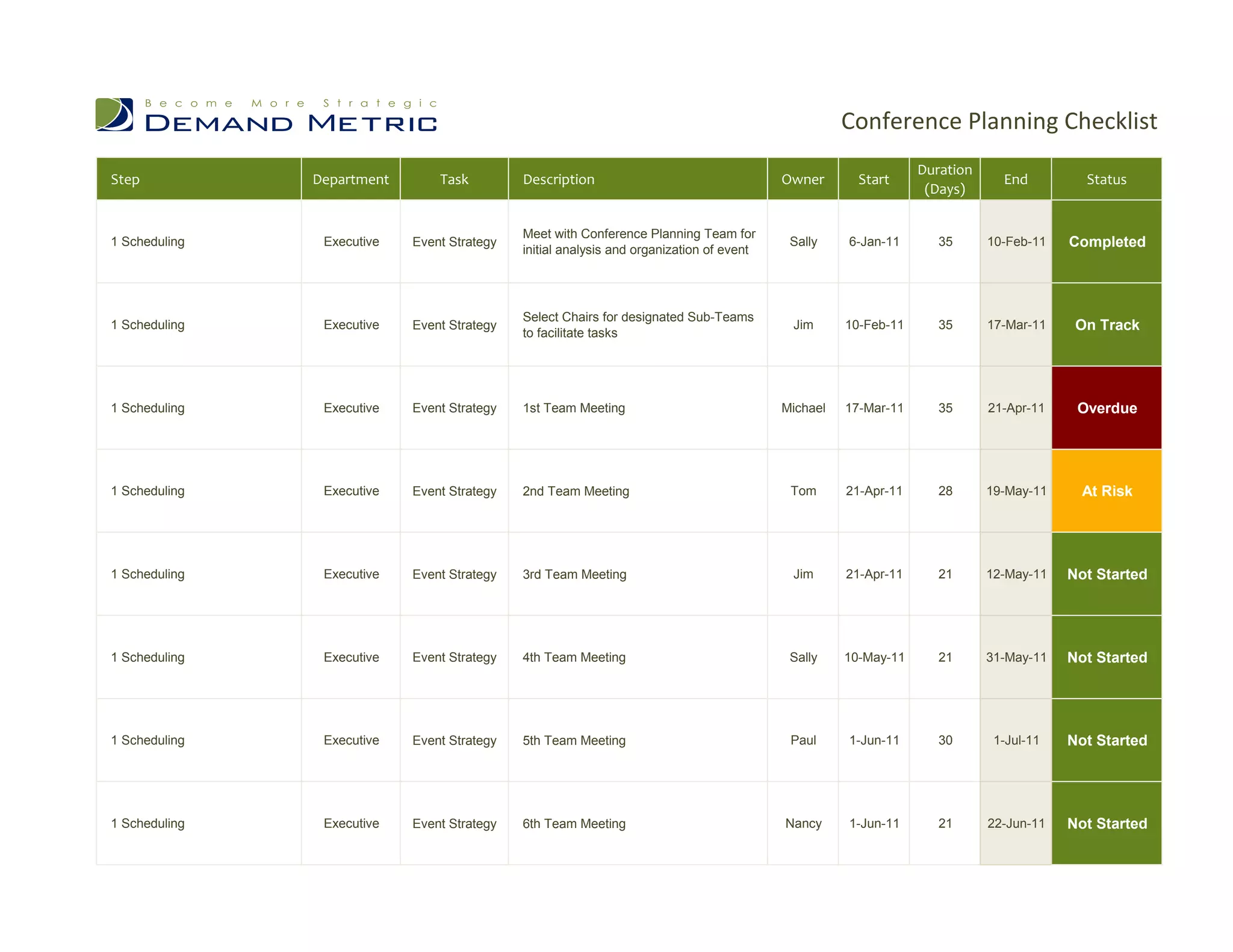 The document is a checklist for planning a conference. It outlines 6 main steps - scheduling, budget, location, decoration/creative, and event preparation. Each step has multiple tasks assigned to different owners with start and end dates. The overall status shows that many tasks are not started or at risk of being overdue. The checklist provides a framework to organize and track progress of the various conference planning responsibilities.