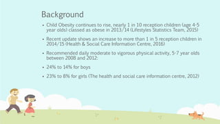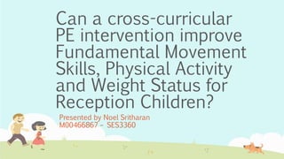 This document summarizes a study that examined the effects of a 5-week cross-curricular physical education intervention on reception children's (ages 4-5) fundamental movement skills, physical activity, and weight status. The intervention incorporated lessons based on the story of "The Gruffalo" and assessed changes in these variables before and after for an intervention school compared to a control school. Key findings were that the intervention significantly improved children's fundamental movement skills and weekday physical activity, but did not significantly impact weight status or weekend physical activity. The intervention provides a model for using cross-curricular lessons to improve movement skills and physical activity in young children.