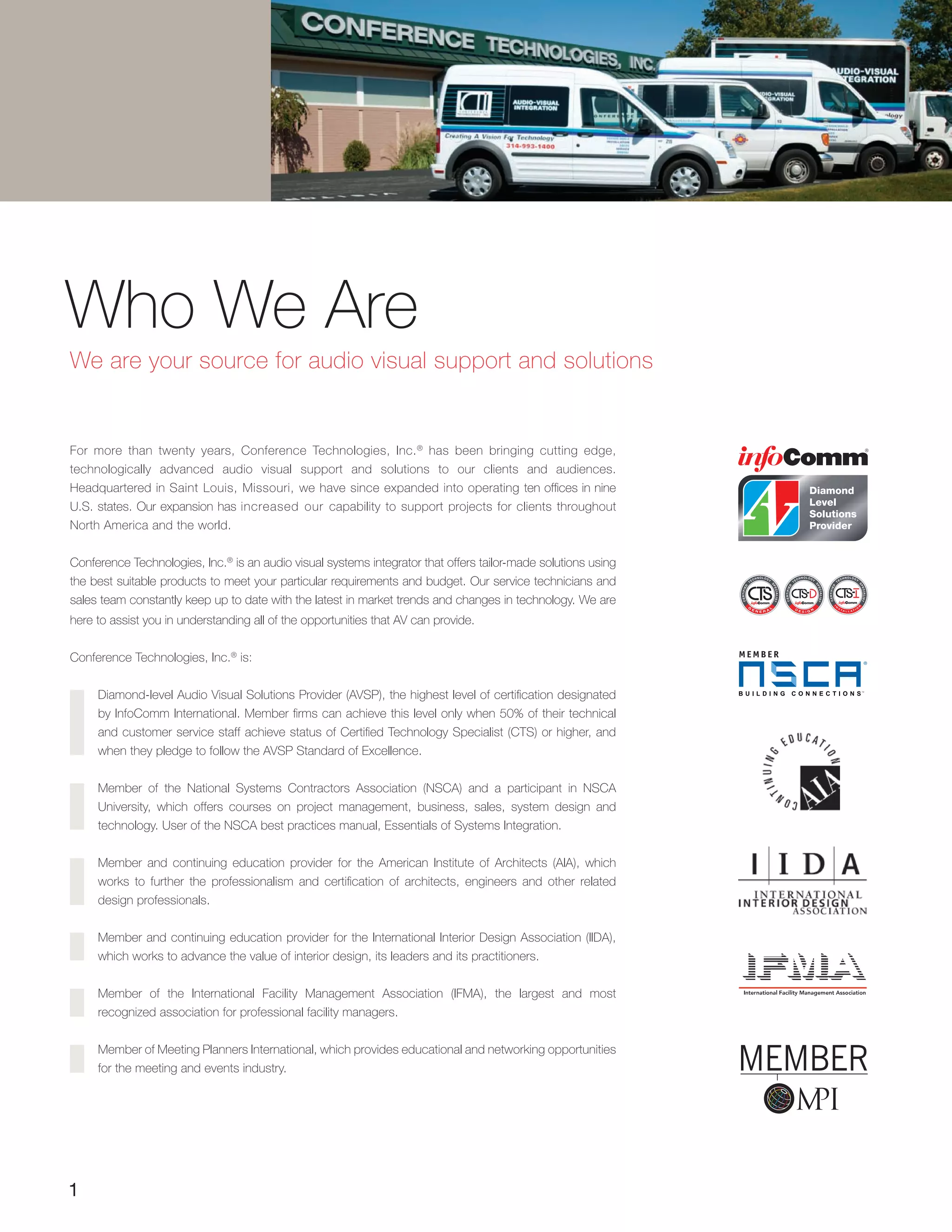 Conference Technologies, Inc. is an audio visual systems integrator that has been providing cutting edge AV solutions for over 20 years. They operate out of 10 offices across the United States and provide consulting, design, installation, and support services for corporate, education, government, healthcare, and other clients. Their services include system design, programming, training, and they have expertise in video conferencing, rental/staging equipment, and litigation support.
