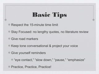 This document provides tips for giving presentations at conferences. It begins by emphasizing the importance of respecting time limits, staying focused, and practicing. It then discusses different presentation materials like PowerPoint, Prezi, and timelines. While PowerPoint and Keynote are commonly used, the document cautions they can be overused or poorly designed. Alternative options like Prezi and digital timelines are presented. The document concludes by advising presenters to prepare for technical problems and remain confident in their expertise on the topic.