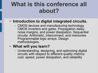 This document discusses digital integrated circuits and their design, covering topics such as CMOS technology, design methodologies, and challenges in digital circuit design. It highlights the evolution of microprocessors following Moore's Law, alongside issues related to power dissipation, reliability, and scaling challenges. The document emphasizes the importance of understanding design metrics like cost, speed, and power dissipation for optimizing digital circuits.