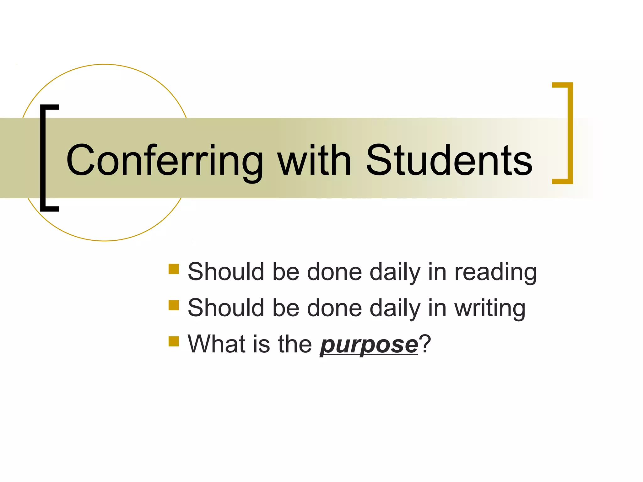 This document discusses conferring with students and contains several sections on counterfeit beliefs about conferring, the RIP model for conference structure, instructional aspects of conferring, and what students in the class can be doing while the teacher is conferring with individual students. The key points are that conferring should be done daily in reading and writing, the purpose is to discuss students' reading and writing processes, and effective conferring involves reviewing past work, instruction on strategies, and setting goals for future work.