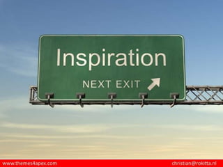This document discusses designing web pages for Oracle Application Express (APEX) without being a professional web designer. It provides an overview of the skills, tools, and techniques used for APEX development. Specific topics covered include the APEX template framework, HTML, CSS, JavaScript, image editing, and creating or customizing themes. The document encourages developers to get inspired from design examples and to start modifying existing themes to achieve basic customization goals.