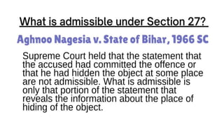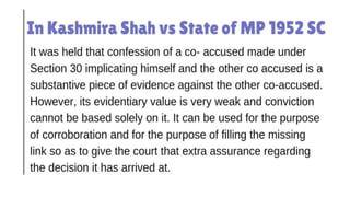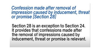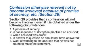 This document discusses the meaning and relevance of confessions in criminal cases under Indian law. It defines a confession as an admission by an accused person that they committed an offense. All confessions are admissions, but not all admissions are confessions. The document outlines when confessions are considered relevant evidence, such as when they are not made under inducement, threat or promise to gain advantage, and when they lead to the discovery of factual information. It also discusses sections of Indian law that pertain to the admissibility of confessions made to police or in police custody.